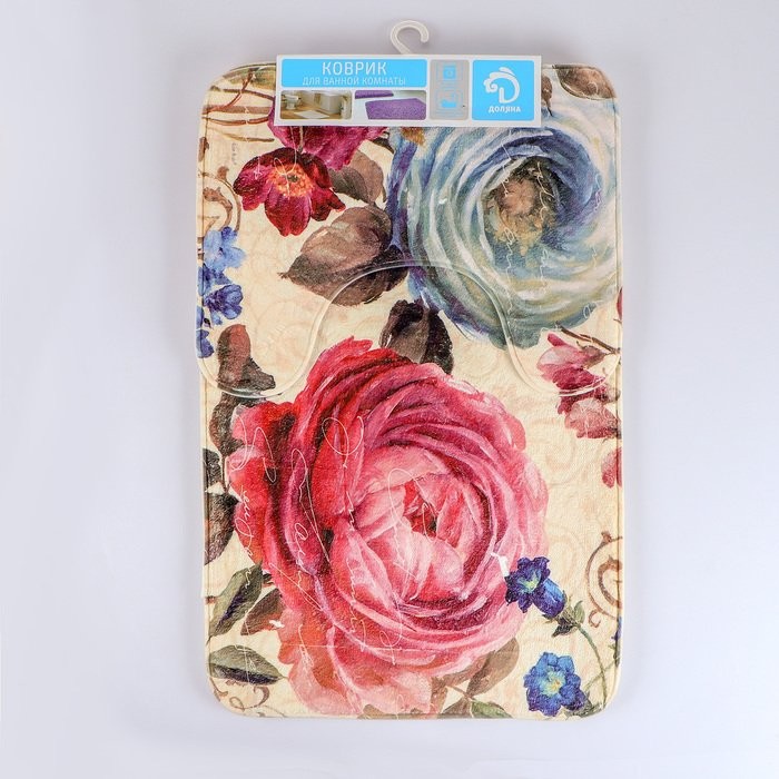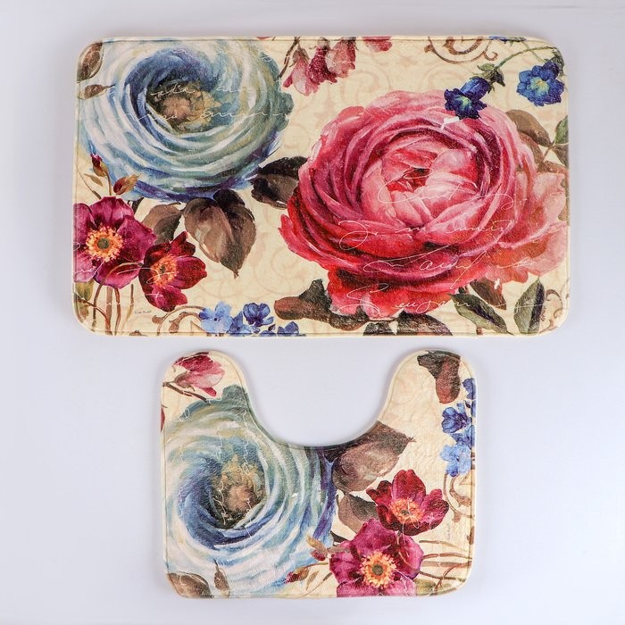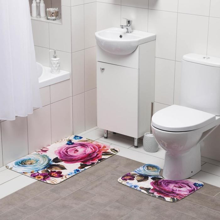 Набор ковриков для ванны и туалета Доляна «Пионы», 2 шт: 39×49, 50×80 см, цвет серый