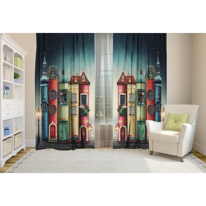 Комплект штор Разноцветные домики, 147×267 +/- 3см 2шт, габардин, п/э100%